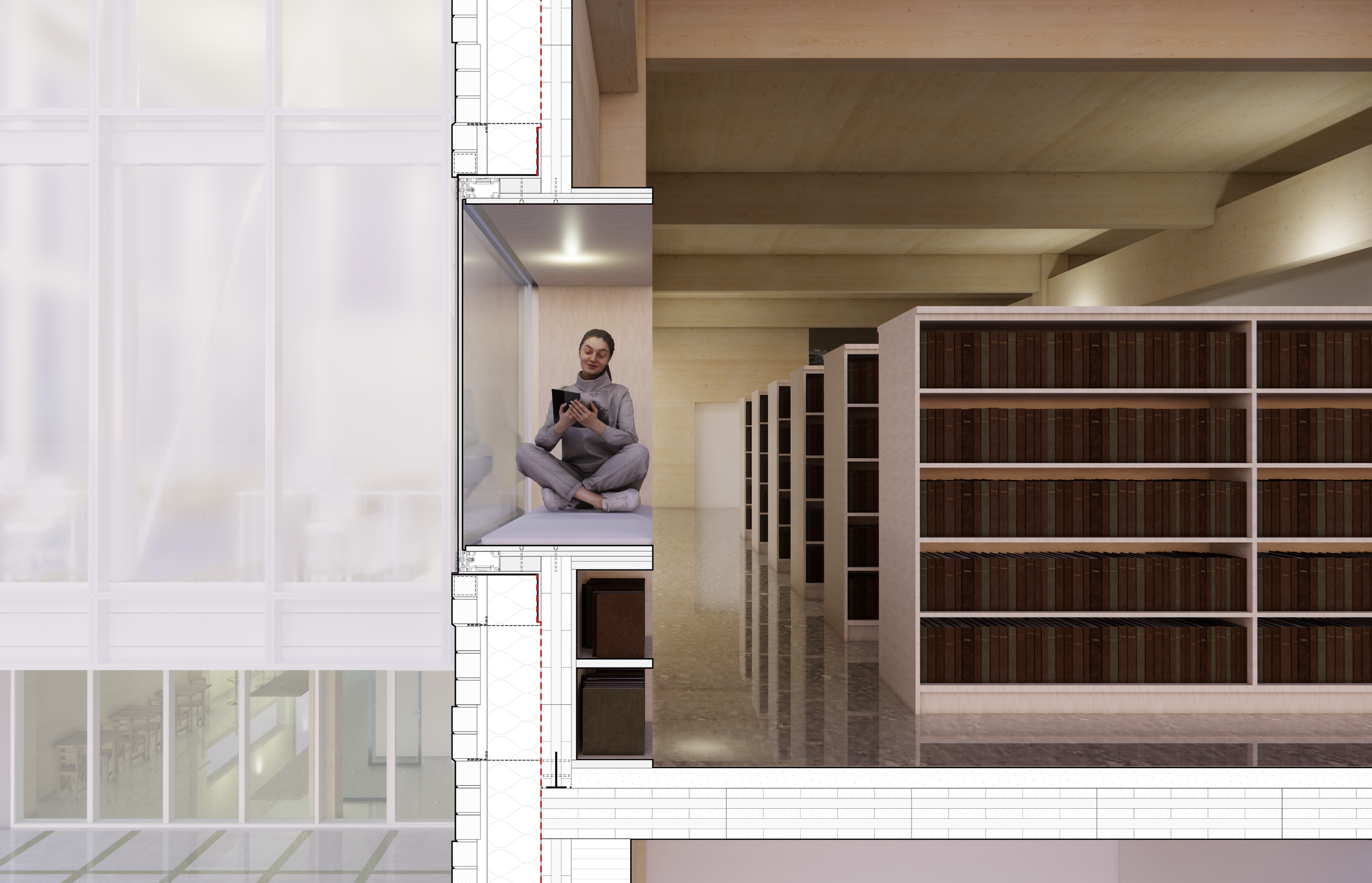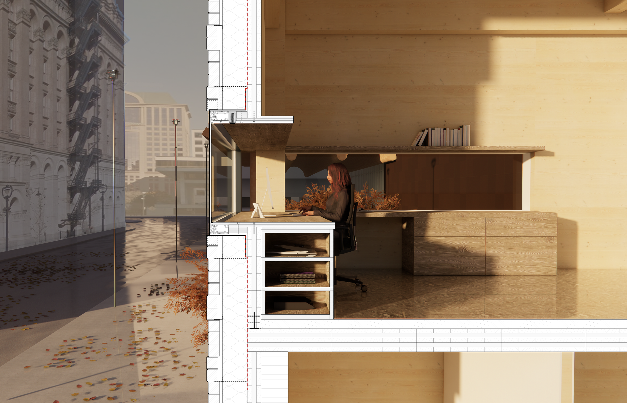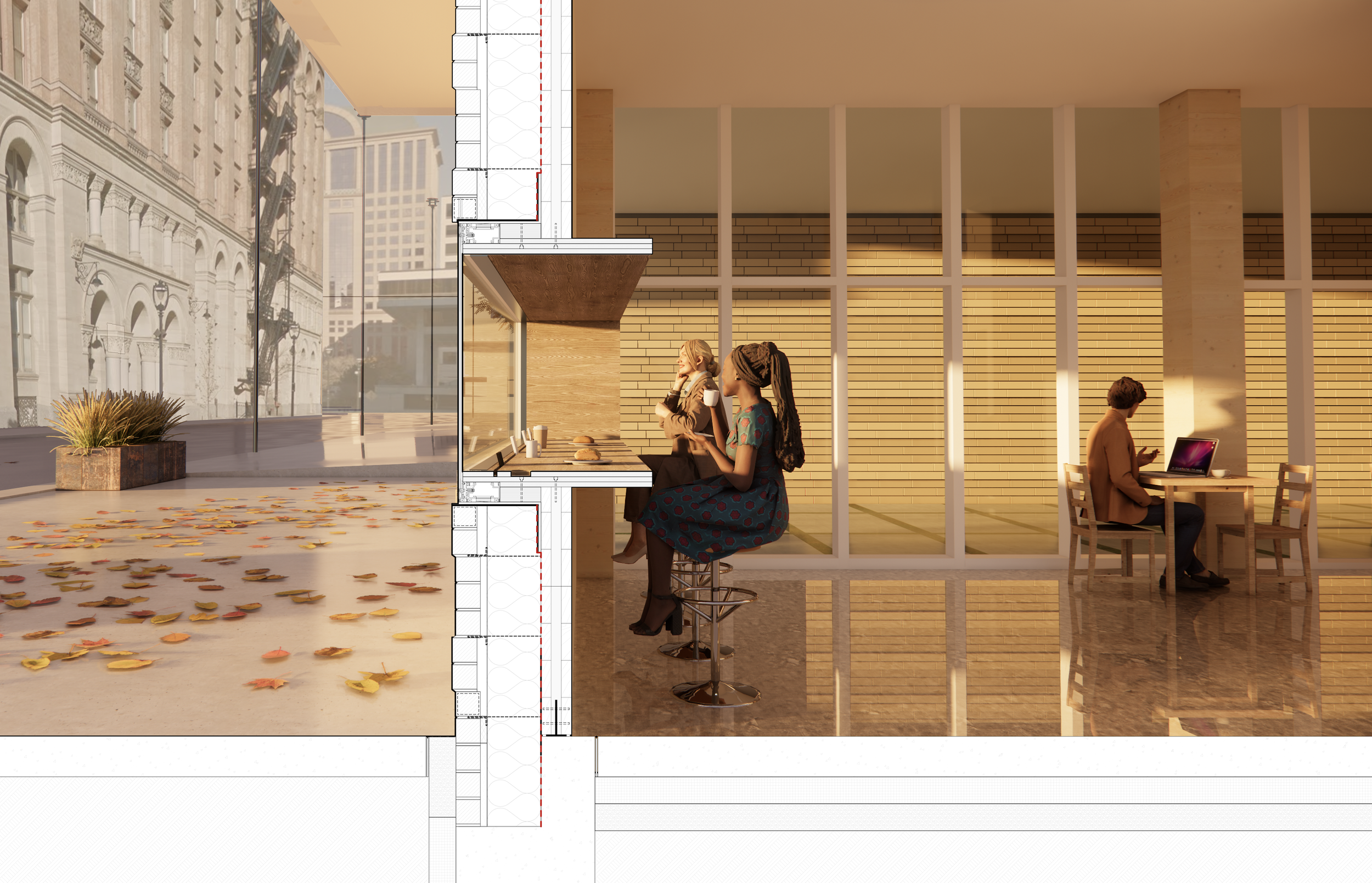 The building translates its urban context into two primary gestures: a brick footprint echoing City Hall and a cantilevered glass lantern inspired by the BMO building.