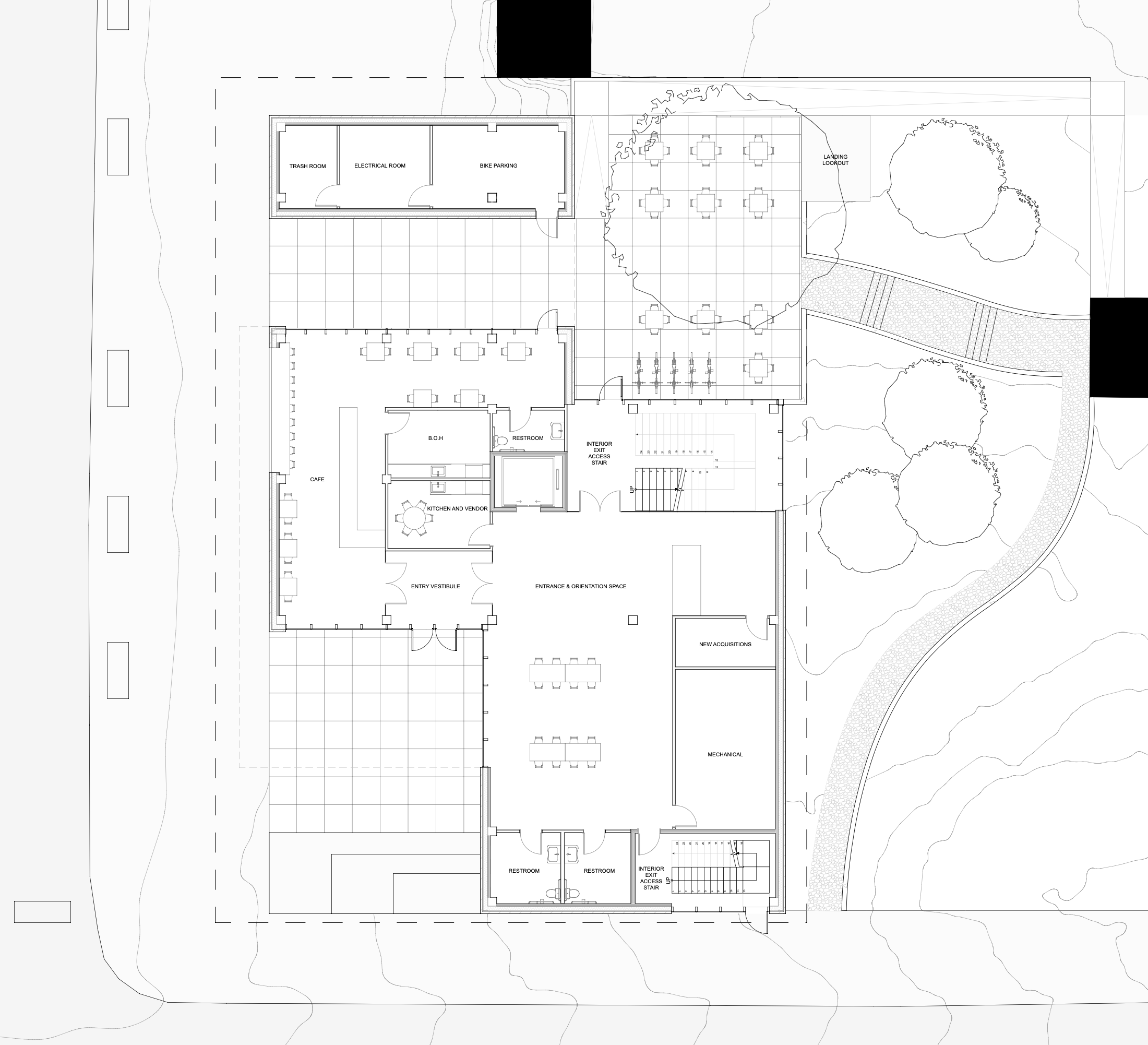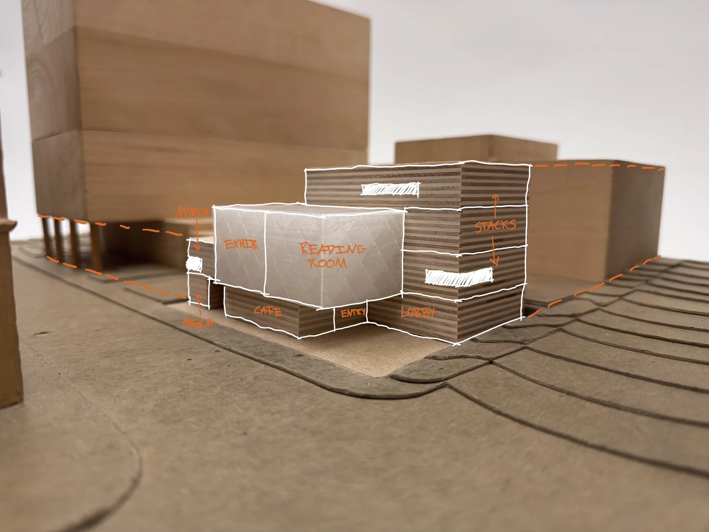 The height of the footprint is contextual to its adjacencies by matching the negative and positive spaces. The primary program is then centered in the massing, cantilevered over the entry, and directly addresses the street corner.