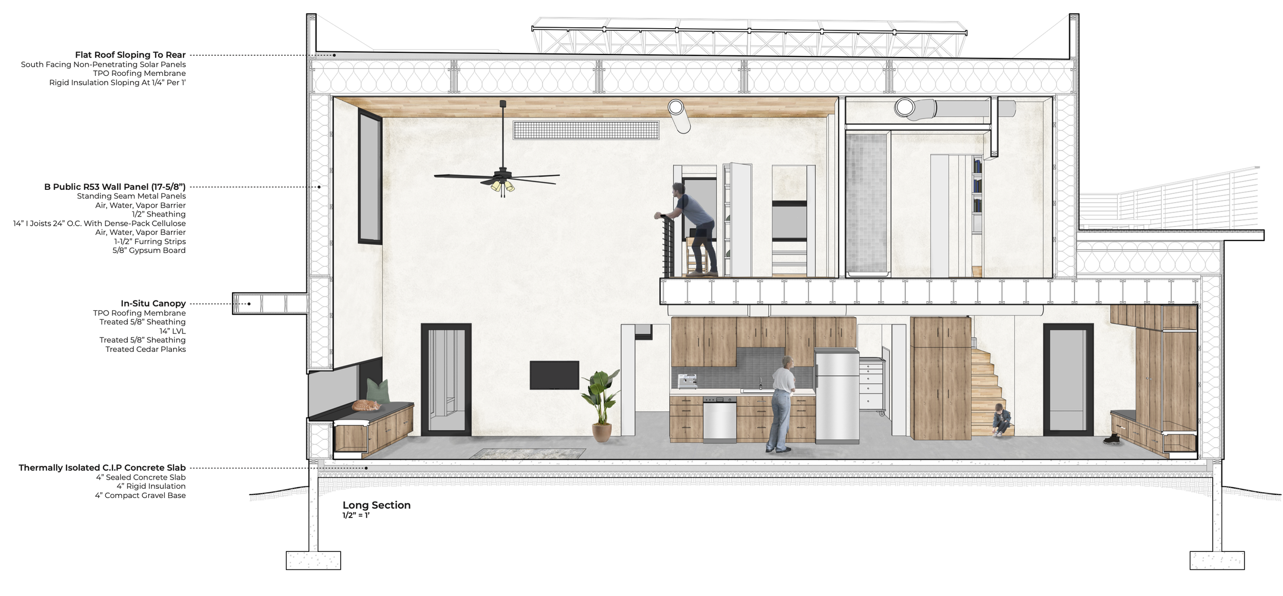 Thoughtfully placed apertures allow for proper lighting, ventilation, and structural integration with standard sized panels. A cast-in-place slab provides radiant heating and a flat roof eliminates un-usable interior volume.