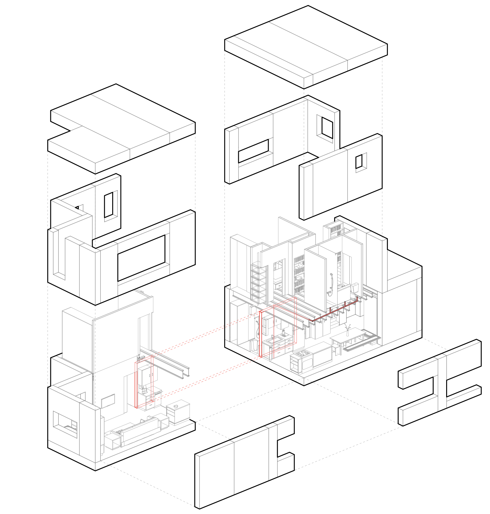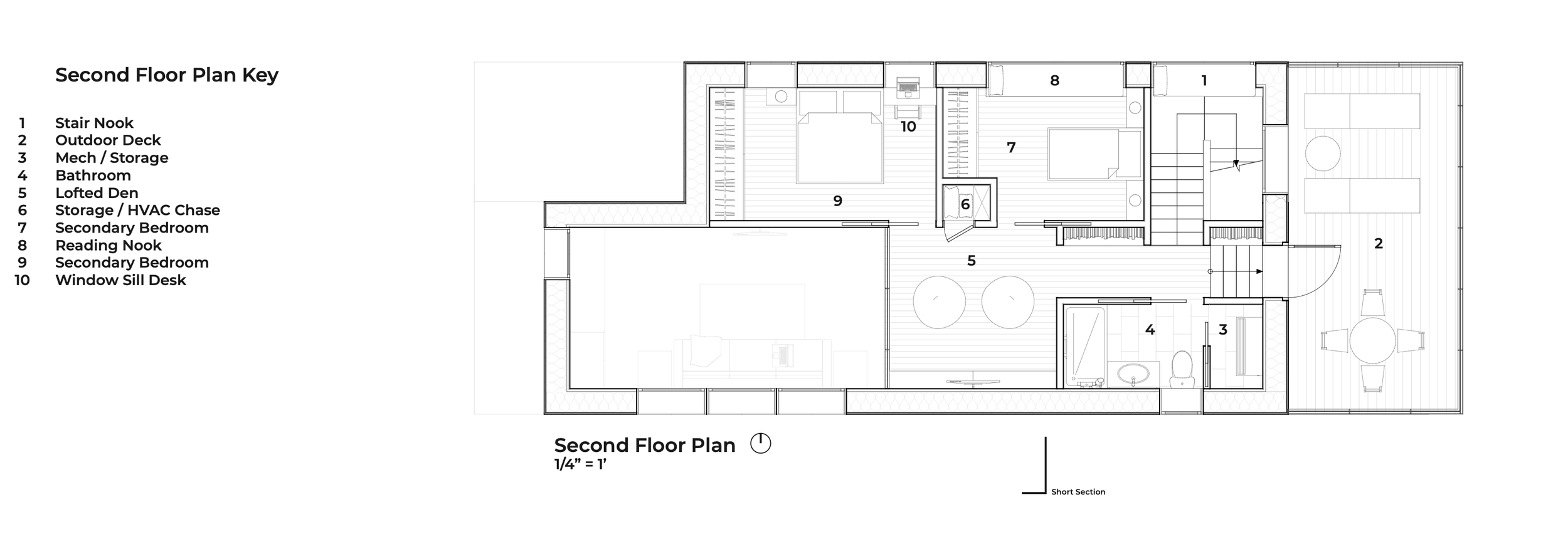 At the center of the homes efficiency is a singular plumbing wall which is connected to all of the major water hookups. This organizes the plan to revolve around a center nucleus.
